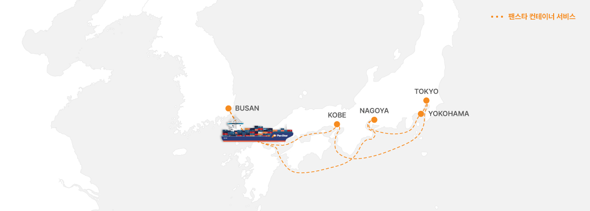 팬스타 컨테이너선 서비스는 일본의 주요지역인 한신과 게이힌지방을 대표하는 도시들인 고베, 도쿄, 요코하마 및 나고야를 관통하는 서비스를 제공하고 있습니다. 일본의 주요 대도시들을 연결하여 수출입자의 물류를 더욱 편하고 원활하게 만들고자 합니다.