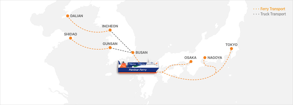 PanStar Korea Land Bridge是以陆上保税运输的方式把中国山东半岛等在中国全地区通航的韩中汽车渡轮和韩日航线的Pan Star渡轮连接起来,使从中国到日本大阪、东京、敦贺能三天内到达(Lead time40个小时)的服务。从中国到日本通过航空或者航空&航运服务运输的货物,按照原来的Lead-Time也可以实现输送,节省了货主的物流费。