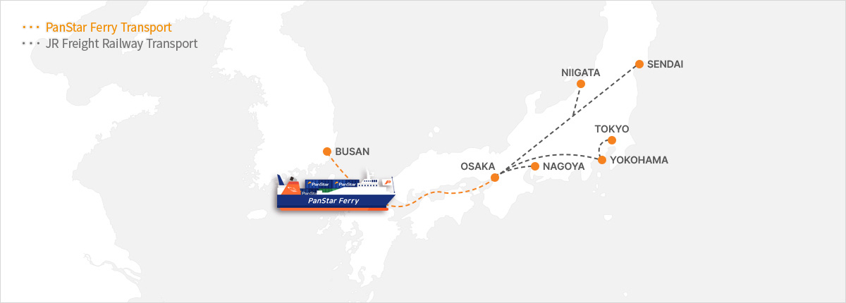Pan Star把釜山和日本之间运行的渡轮和以正确准时的行程安排著名的JR货物铁路连接起来,构建了连接全日本的物流路线。
