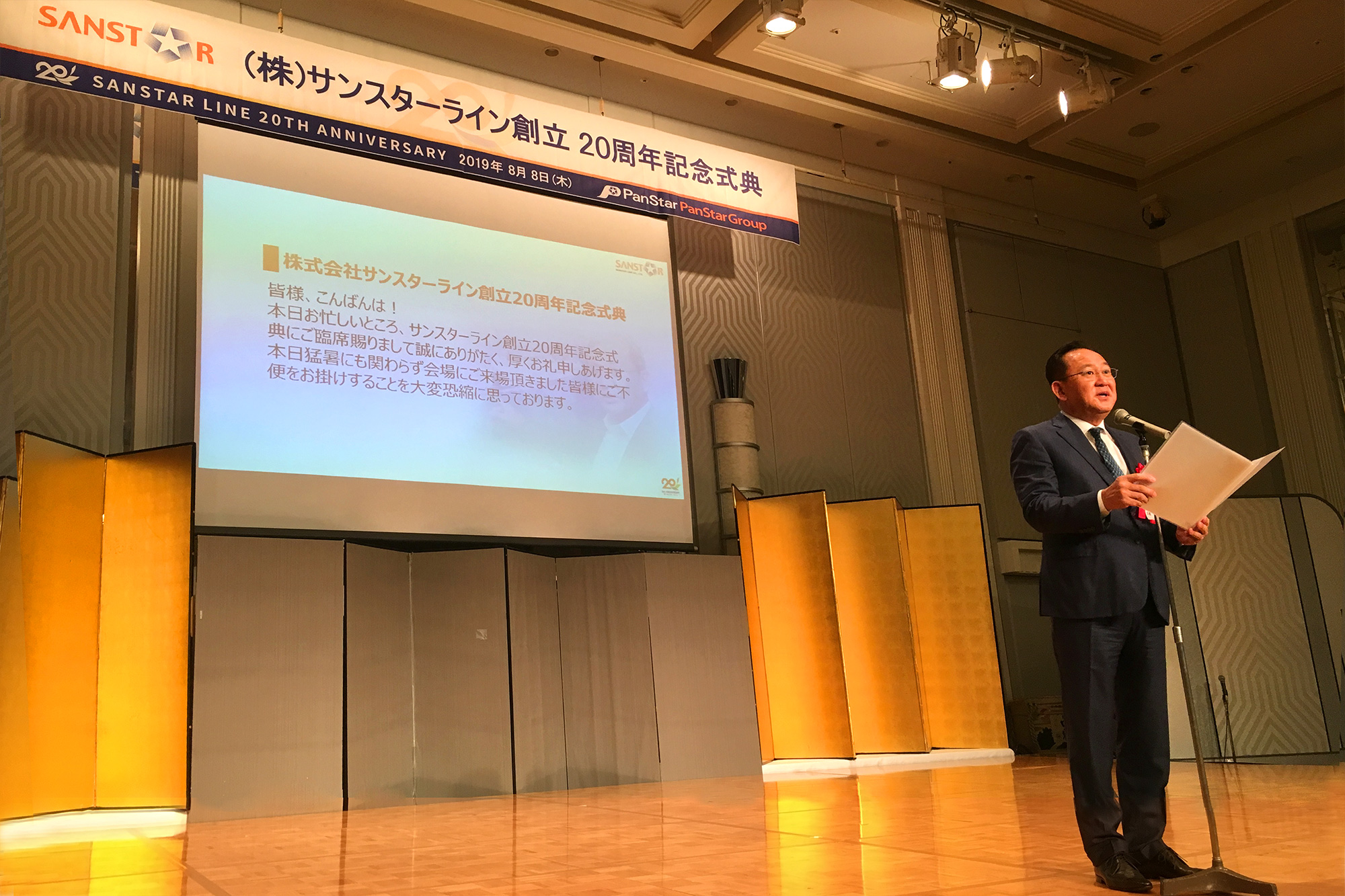 - 한국계 일본 물류회사 ‘산스타라인’ 창립 20주년 - 한국계 일본 물류회사인 산스타라인(SANSTARLINE)의 창립 20주년 기념식이 8월 8일 오후 5시 30분 오사카 뉴오타니호텔에서 열렸다. 이날 행사에는 오태규 주오사카 총영사를 비롯해, 모리시타 유카타 카시하라시장, 쿠보 마사미 ㈜카미구미 회장 겸 일본항운협회장, 후쿠이 준타 오사카부 항만국장